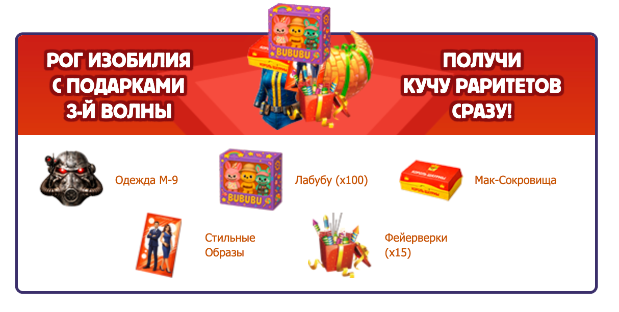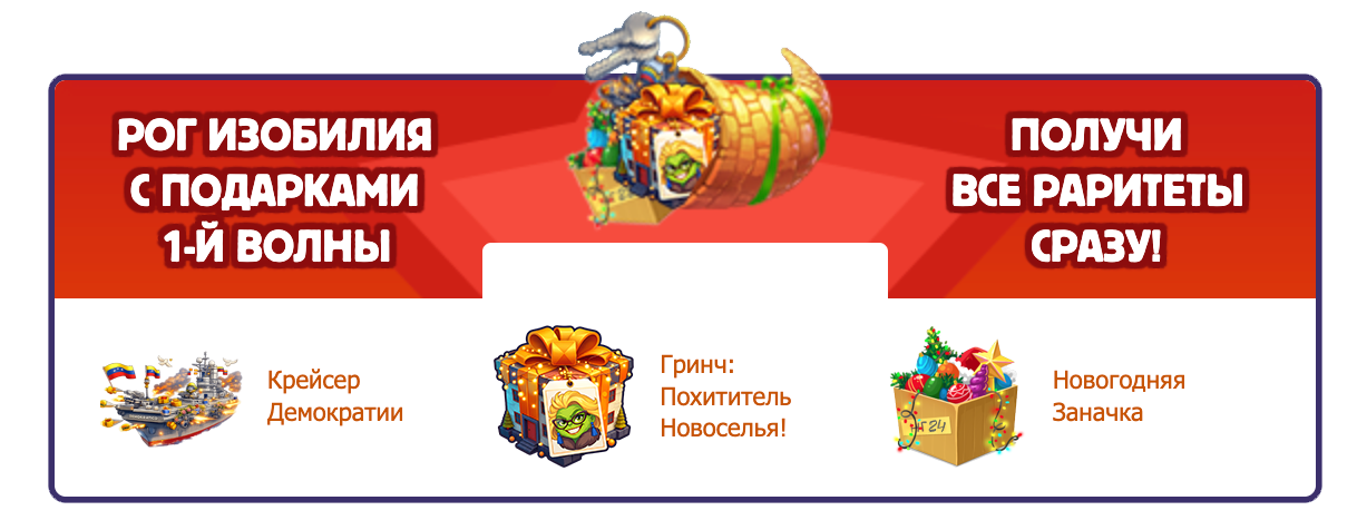 Во всех текущих подарках можно найти рог изобилия с раритетами текущего этапа.