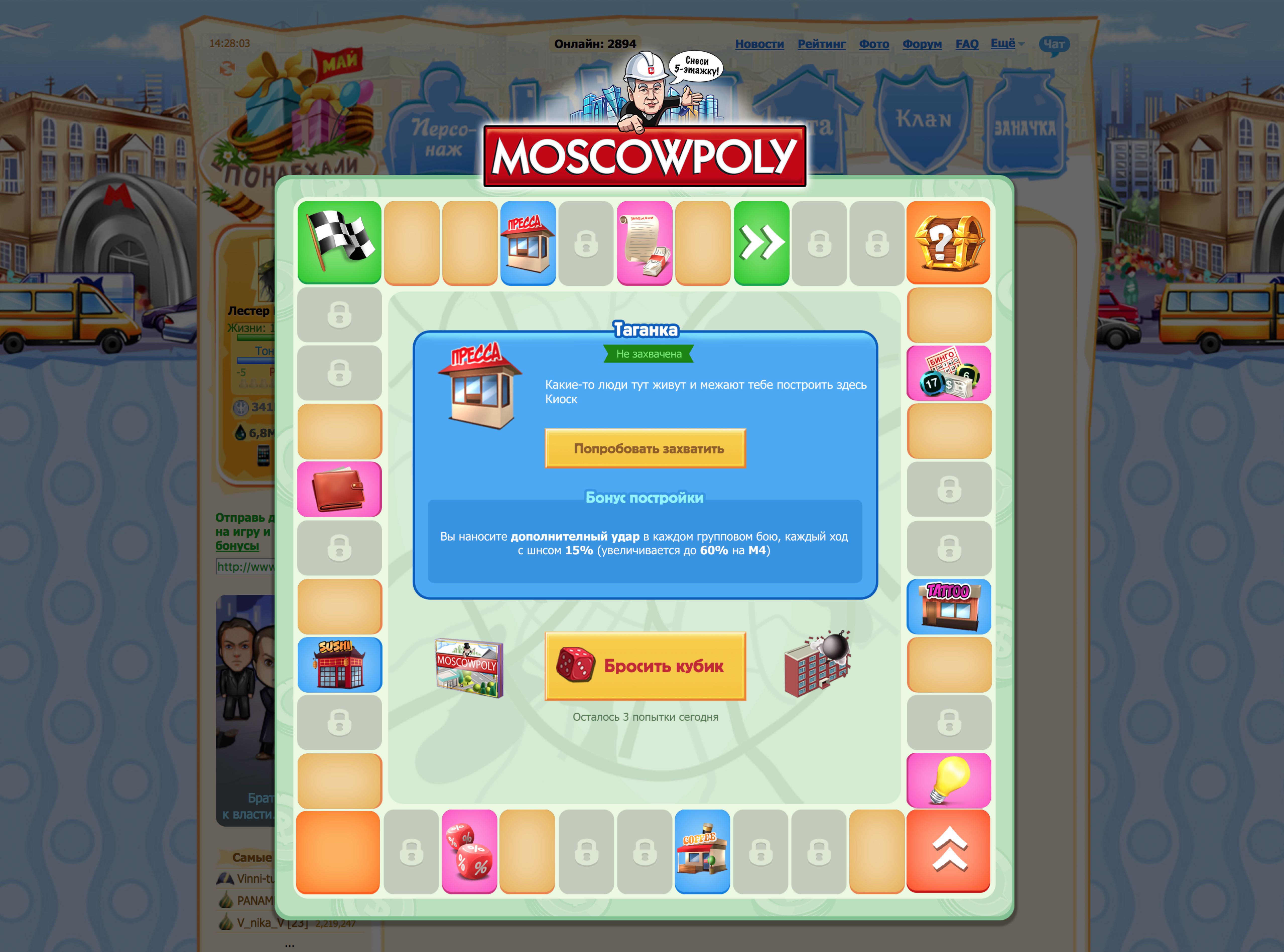 После открытия улиц их можно и нужно улучшать, чтобы увеличивать получаемые бонусы! Необходимые для этого предметы вы можете найти в подарках или получить из самой Москвополии. Каждый игрок может зайти и совершить 3 броска кубика (хода) в Москвополии каждый день. Дополнительные кубики вы также можете найти в подарках!
