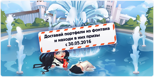 Используйте аттестаты из подарков, чтобы пробраться к фонтану и получить шанс стать обладателем потрясающих призов, спрятанных в школьных портфелях! Торопитесь, фонтан открыт только до 13 июня (12.06.2016 23:59)!