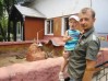 трётся о колени, жалобно скуля.
